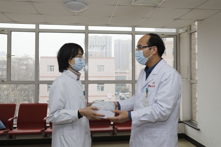 医务处处长赵孝先代表我院接收了白靖同志的爱心物资,这批护目镜将转交后勤保障处针对临床一线进行合理调配。