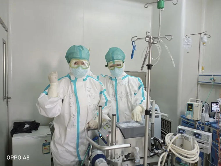 ECMO组的郭少罕主管医师和李建宇主管护师,刚刚从秦皇岛一线撤下来,立刻来到唐山,再次进入重症监护病房。第一天上ECMO就是凌晨三点,整整一夜,把患者从死亡边缘拉了回来。之后的工作更是没有了白天黑夜。