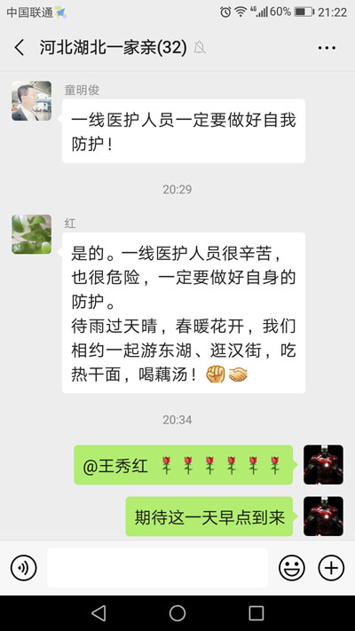 对于出院患者,我们建立一个“河北湖北一家亲”的微信群,河北和湖北的战友们对出院患者的肺康复、心理等问题进行答疑解惑,及时跟踪随访。