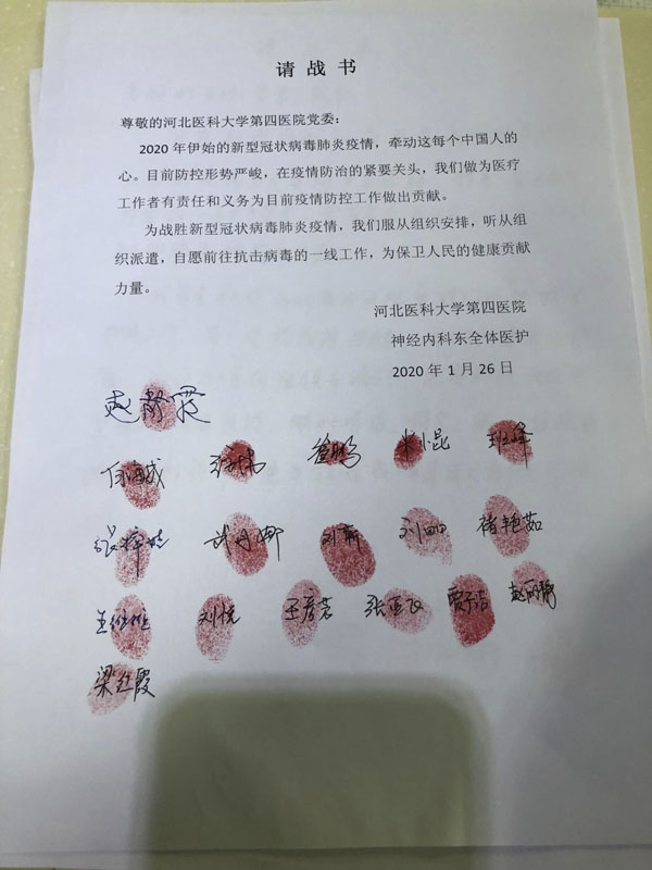 随着疫情形势愈发严峻,河北省卫健委要组建医疗团队前去驰援武汉。接到通知后,科室全体医护人员主动请缨,他们在请战书上庄严地签上了自己的名字并按下红手印,要求到一线去做贡献。按满红手印的请战书熠熠生辉,全科人员随时处于待命状态。