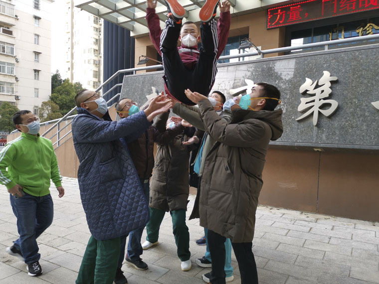 3月14日,重症病房清零,队员们将朱桂军抛起庆祝