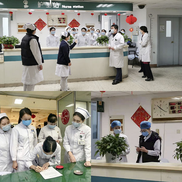 他们对病房、护士站、各值班室、医办室、换药室每日通风两次,每次30分钟;他们使用500mg/L含氯消毒液擦拭护士站台面、治疗室操作台、护士站电脑、打印机、椅子扶手、门把手(护士站、医办室、值班室)、体温枪,每日两次;他们使用紫外线消毒病房、各值班室,每日一次,每次0.5至1小时。他们为住院患者宣讲疫情防控知识、演练七步洗手法以及如何使用快速手消液等,在保障患者医疗有序不紊进行的前提下,这些细致的消毒、手卫生和疫情宣教工作,成为他们每日牢记于心并坚定于行的行动。他们始终以患者为中心,认真落实放五科疫情期间新住院患者诊疗细则,对每一位患者及家属进行排查,保证所有在院患者及工作人员的安全。由于放疗科的特殊性,他们认真登记患者及家属出入记录,包括床号、姓名、出入时间、去向及联系电话,严格交接班。一位患者在出院时留下一张卡片:“在人人自危的疫情期间,你们织起了一张巨大的‘安全网’,把我们紧紧地罩在里面,让我们觉得安心。”