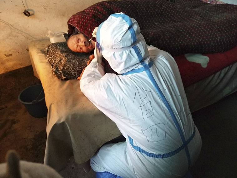 在核酸采集工作中,有一些特殊人群,幼小的宝宝、脑瘫儿童、行动不便的老人等,需要特殊的对待。对于几个月的宝宝,队员们耐心细致,引导着家长哄着孩子协助采集,从不催促且动作尽量轻柔;对于行动不便的老人,队员们在村委会的陪同下主动上门采集核酸。面对特殊的群体,队员们或屈蹲着身子、或弯下腰、或耐心引导,他们的眼神闪烁着专注的光芒,因为他们的内心充满了信念,充满了爱。