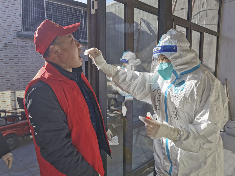 凌晨4:30,我们30人集结于医院,整装待发,奔赴藁城。抵达后迅速组织开展工作,我们被分到四个村子,两人一组负责一个片区,虽然做了充分的准备,但还是遇到了很多困难。我们在零下17度的环境下户外作业,一口气工作10个小时以上,经常是凌晨6点吃早饭,直到下午4、5点才能吃上午饭。如此刺骨的寒冷是我从未体验过的,但是为了不让乡亲们等太久,我们让村干部每次只通知4到5户人家,采集完了再通知其余几户。乡亲们看我们太辛苦,心疼地说:“我们站五分钟都冻得直跺脚,你们一待就是10几个小时,太不容易了。”在南营村,60多岁的老村长给我们收集来许多暖宝宝,懂事的小朋友在采完核酸后,向我们深深地鞠躬、敬队礼,乡亲们看见我们隔离衣上写着省四院的标记,纷纷竖起大拇指点头称赞:“省四院,真是棒!”
