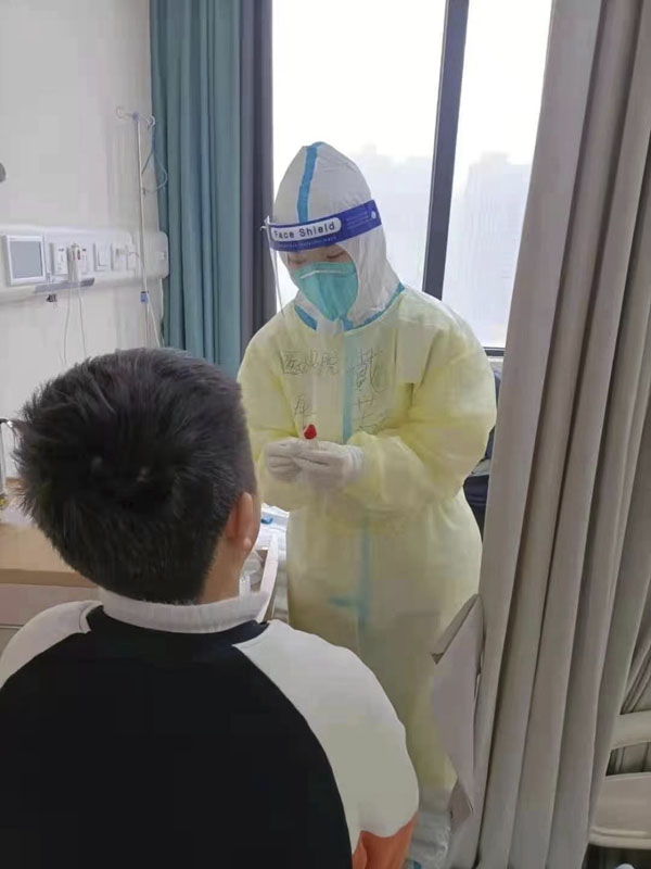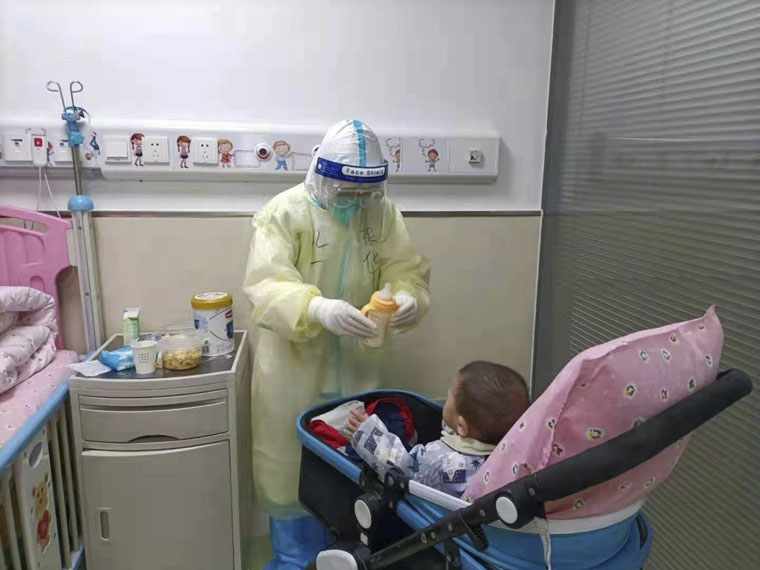 这支医疗队中还有4位儿科的医护人员,尚颖、戴若恒住院医师和马萍、张华主管护师。面对一线工作,尚颖和戴若恒两位年轻医师毫不畏惧、迎难而上,以最快的速度完成感控培训,熟悉工作流程,投入到紧张的日常工作中,时刻关注孩子们的病情和心理变化。新冠儿科病房是没有家陪的,为了照顾孩子们的情绪,病房的墙上贴满了可爱的卡通人物图片,医护人员们也格外的耐心和细心。一张写有“我是战士,我是妈妈”的红色条幅极其醒目。在这里,患儿们离开了妈妈,依然有欢声笑语。马萍和张华两位主管护师每日除了完成自己的治疗工作外,就像妈妈一样照顾着这些孩子们的生活起居,喂奶、喂饭、喂药、哄睡、换尿布、换衣服……每当孩子们拉着她们的手,奶声奶气地说,“阿姨,你就像我妈妈”的时候,心里甜丝丝的感觉可以回味很久。