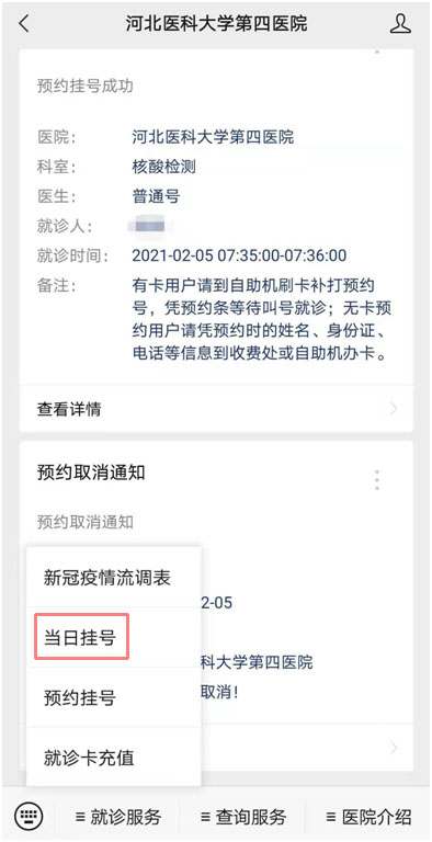 1、点击公众号“就诊服务”,选择“当日挂号”。
