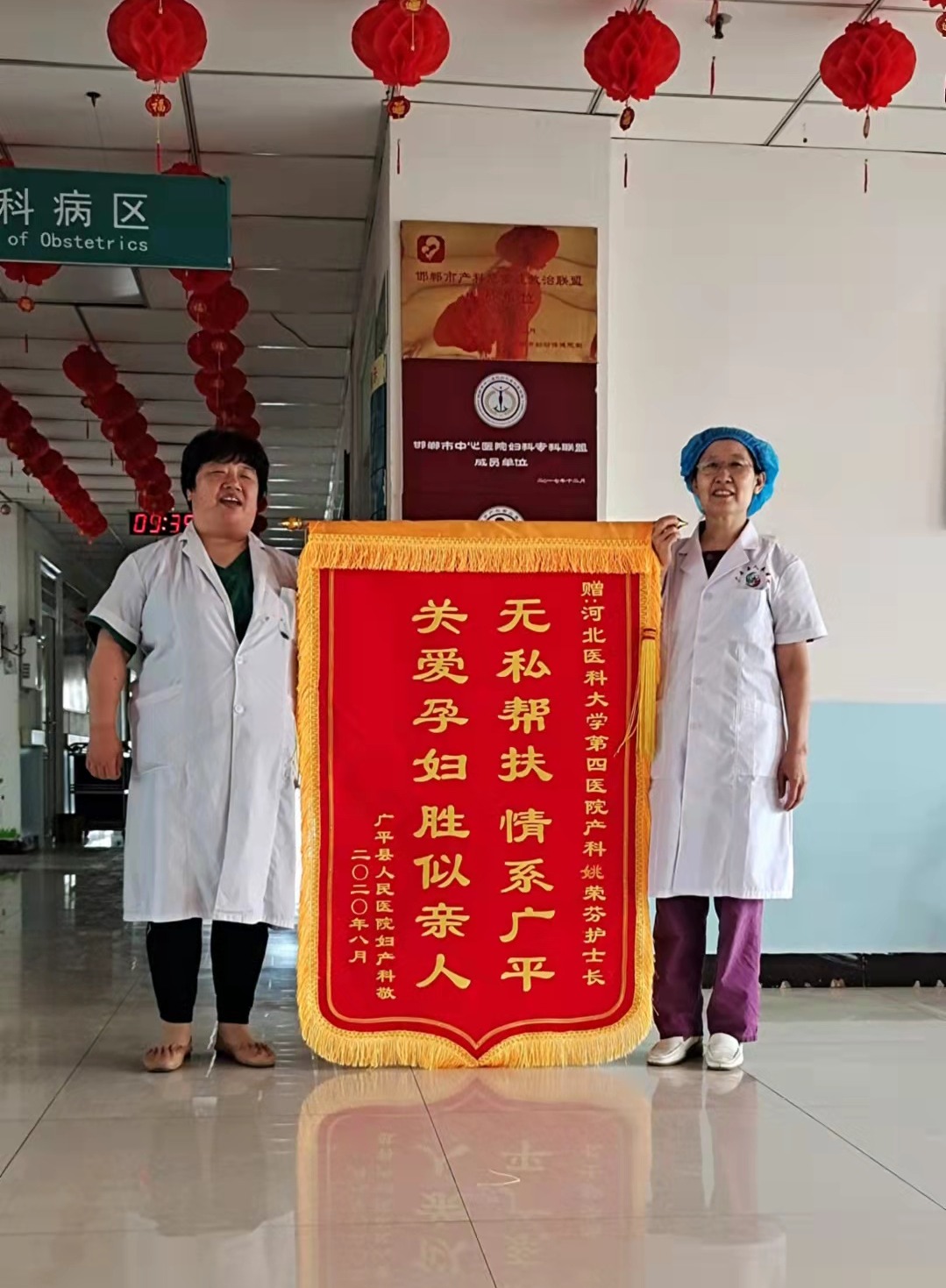 20198月到20218月,产科姚荣芬副主任护师连续两年深入广平县人民医院进行帮扶,协助开展了自由体位分娩、适度会阴保护技术等,使产妇在舒适中分娩。她通过示教、讲座等形式对科室人员进行专业培训,讲解新生儿窒息复苏知识、难产知识并进行技术操作培训,传授新生儿早期肌肤接触、晚断脐的新理念。她的工作和付出得到了很多产妇和家属的认可,被赠送了锦旗。当地医院领导对姚荣芬所作出的贡献表示高度称赞,以广平县人民医院的名义向她赠送锦旗。
