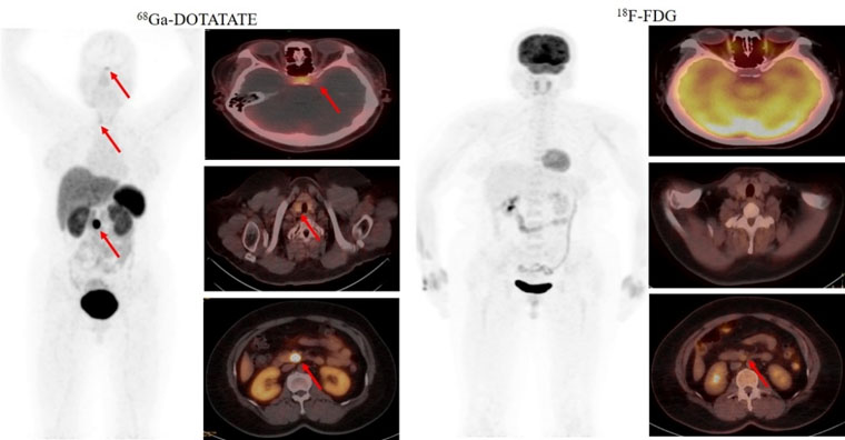 首个病例患者为一名49岁的女性,间断低血糖超过1年,甲状旁腺激素检查异常升高。脑MRI提示为脑垂体微腺瘤,上腹部MRI检查未发现明显异常。但临床怀疑胰腺存在病变,经新探针68Ga-DOTATATE PET/CT检查,发现了胰腺病灶,综合诊断多发性内分泌瘤病I型(MEN1型)。经胰腺穿刺病理证实为神经内分泌肿瘤G268Ga-DOTATATE18F-FDG PET/CT双核素的检查结果为患者临床精准诊疗提供了胰腺病灶的影像学证据。