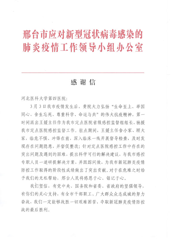 来自邢台的感谢信!王媛副主任深入一线督导院感防控工作