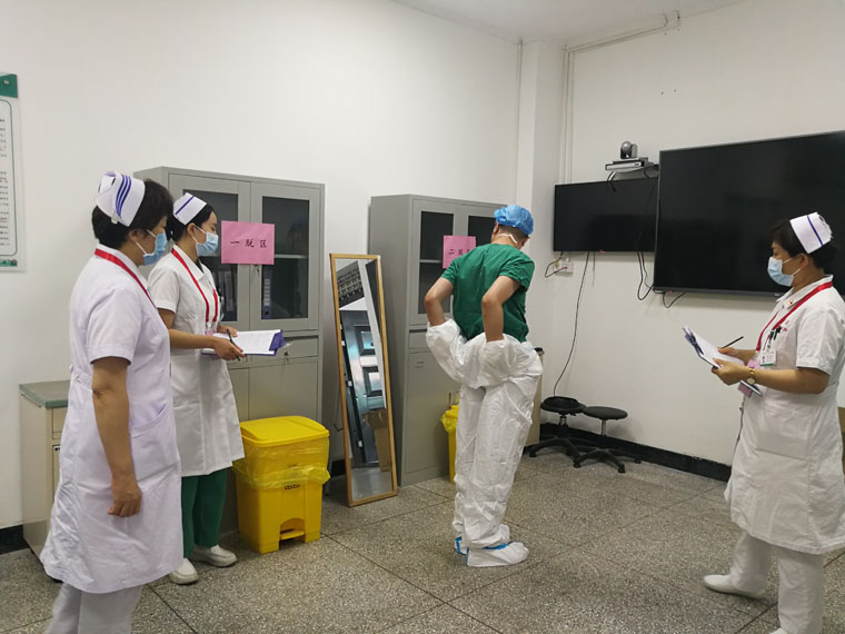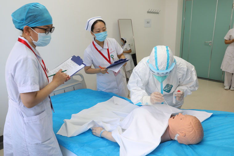 比赛当日,88名选手参加单项个人赛,其中本部55人,东院33人。考核以“赛道式”进行,涉及静脉留置针输液、心肺复苏+抢救药拿取、穿脱防护服+咽拭子采集等项目。选手抽取案例题,依照题目限时完成评估患者、准备用物、实施操作、理论答题等环节。赛场上,各位年轻的选手动作娴熟,通过扎实的专业知识认真回答了评委的提问。