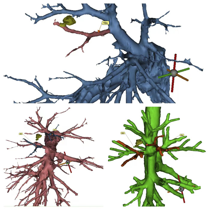 患者为一名50岁女性,体检发现右肺上叶有一枚高危结节,需要尽快手术治疗。医生借助三维CT支气管血管重建(3D-CTBA),发现结节位于右肺上叶前段外亚段与后段外亚段之间,为保证手术切缘并达到手术根治性,需行S2b+S3a切除术。
