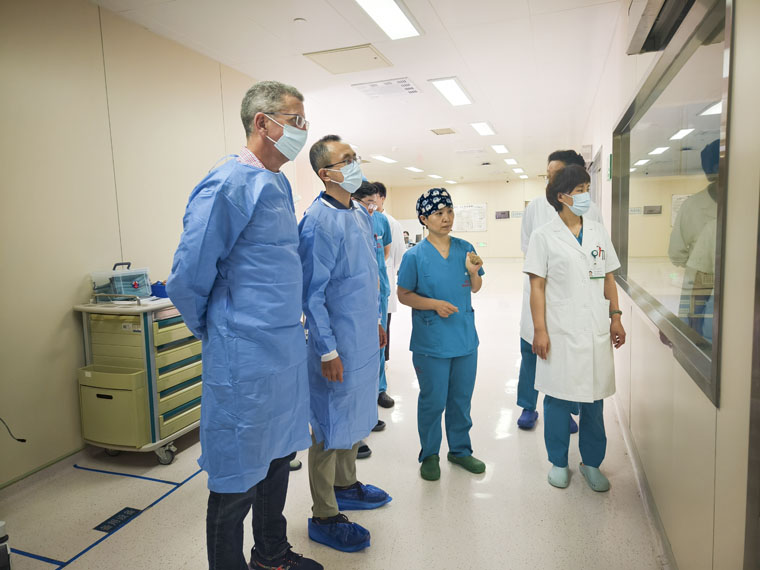 交流现场,胡振杰主任介绍了科室发展情况,并与蔡斯教授深入交流了中新两国重症医学的发展历程。随后,蔡斯教授一行参观了我院重症医学科发展历程展,在病区详细了解各种设备的功能、用途等,对科室高效有序的运作模式表示由衷赞赏。
