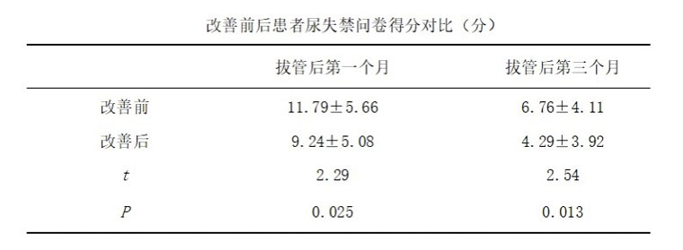 患者尿失禁情况得到显著改善,患者第一个月和第三个月的尿失禁得分明显降低,患者生活质量得到改善。
