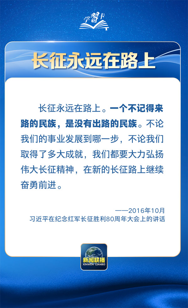 2016年10月21日,习近平总书记在纪念红军长征胜利80周年大会上强调要弘扬伟大长征精神,走好今天的长征路。