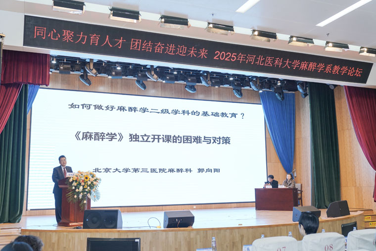 学校党委副书记武宇明在会上代表学校向关心和支持麻醉学专业发展的各位嘉宾表达了诚挚的感谢。她强调,河北医科大学麻醉学系是一支充满情怀、勇于担当、具备能力的教学团队,从老前辈张立生教授创办麻醉学专业教育开始,传承发扬,历经几代人的不懈努力,为国家培养了3000多名合格的麻醉学本科毕业生,遍布全国30多个省、自治区、直辖市,为推进健康河北、健康中国建设提供了坚实的人才支持和医疗保障。特别是去年11月,学校举办的麻醉学专业本科教育30周年庆典活动,进一步扩大了学科的影响力,对于传承麻醉学专业的优良传统,弘扬人民至上、生命至上的崇高精神,守护人民群众的生命健康产生了深远的影响。