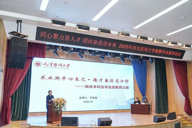 1月4日,河北医科大学麻醉学系在我院新医技病房楼报告厅举办了2025年教学论坛暨新年联欢会。本次论坛的主题为“同心聚力育人才,团结奋进迎未来”。河北医科大学党委副书记武宇明、我院党委书记李立平、副院长田晓玲,以及来自北京大学第三医院麻醉科主任郭向阳、天津医科大学总医院麻醉科主任于泳浩、天津医科大学第二医院麻醉科主任卢悦淳等多位麻醉领域专家学者出席会议。