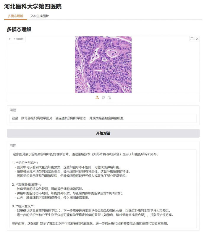 传统病理诊断主要依赖人工阅片,过程耗时长、效率较低,且易受主观因素影响。为提高病理诊断准确性与效能,病理科团队与技术团队紧密合作,依托多模态深度学习技术,采用视觉编码解耦策略病理图像进行特征提取,优化训练策略并进行大规模数据训练,成功部署基于前沿DeepSeek技术的Janus-Pro-7B多模态病理大模型。该模型具备多模态理解与生成能力可迅速识别病理切片中的关键病灶区域,生成结构化结果,为病理医生提供更为客观、高效的病理结果,辅助病理诊断,提高诊断准确性、一致性与效能