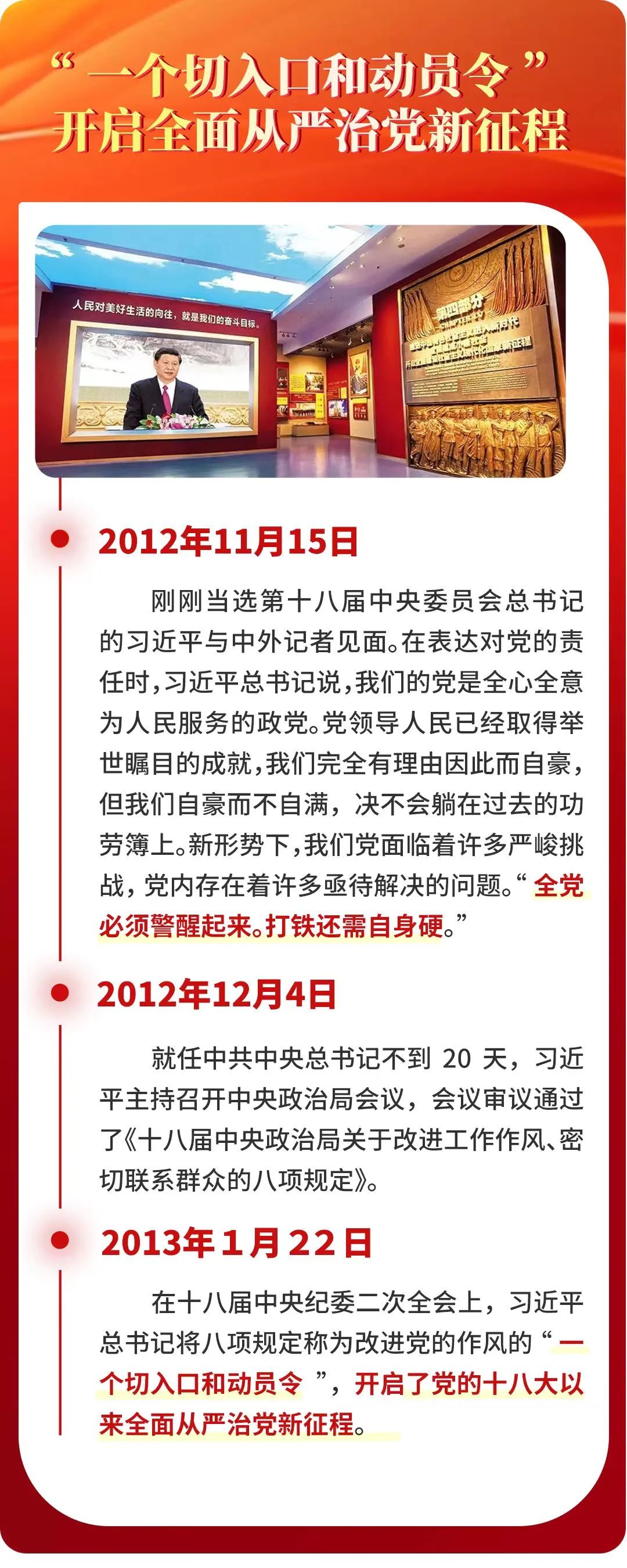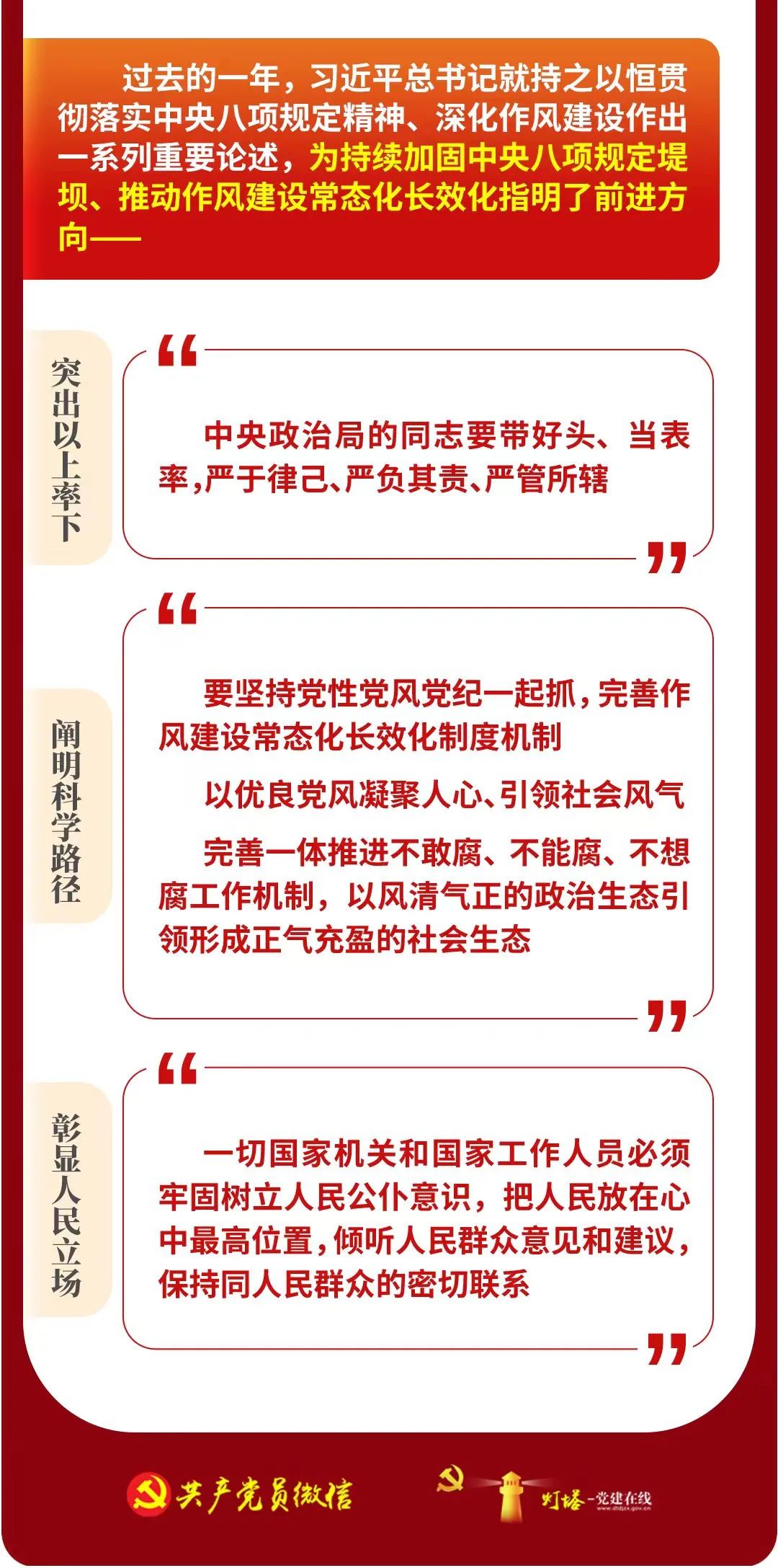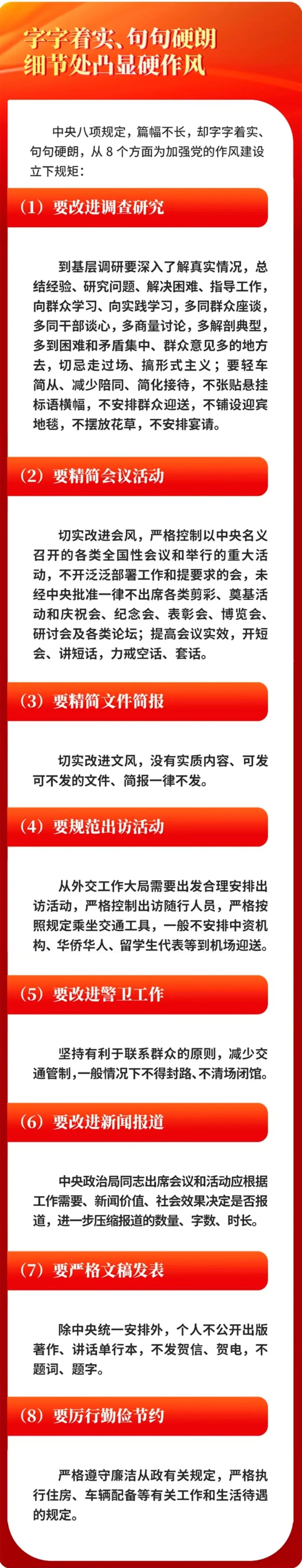 中央八项规定,短短600余字,涉及改进调查研究、精简会议活动等多方面。自出台以来,中央八项规定带来的党风政风社风民风变化,深刻影响和改变着中国,成为新时代中国共产党作风建设的“金色名片”。