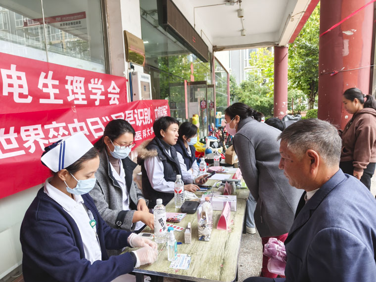 在本部门诊楼大厅,神经内科韩颖教授、心血管内科张思洁教授、内分泌科檀淼主治医师及神经内科护士长王娇兰组成专家团,为市民提供血压测量、病史问询、用药指导等服务,耐心解答脑卒中预防、康复等问题。同期,神经内科米小昆副教授与心内科、内分泌科医护骨干组成专家服务团队,赴宋营镇天然城、天地荣域等多个社区,聚焦中老年群体高发的高血压、糖尿病等卒中危险因素,开展针对性筛查与健康评估,并同步向居民发放《脑卒中防治手册》等科普资料。