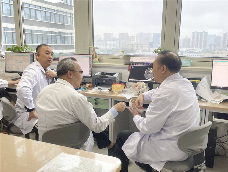 经过多学科深入讨论,并与患者及家属充分沟通后,团队最终决定实施术中放疗。术前,东院神经外科病区主任李建峰与乳腺血液放疗科主任刘志坤就手术方式、重要结构保护、可能残留肿瘤区域、放射施用器的放置位置及治疗剂量等关键问题再次进行了细致规划,制定了周密的治疗方案,力求在确保在杀灭残余癌细胞的同时,将视神经、血管等重要结构的辐射损伤降至最低,实现最佳治疗效果。