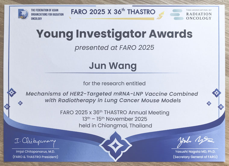 我院王军教授荣获亚洲放疗联盟(FARO)“青年研究者奖”