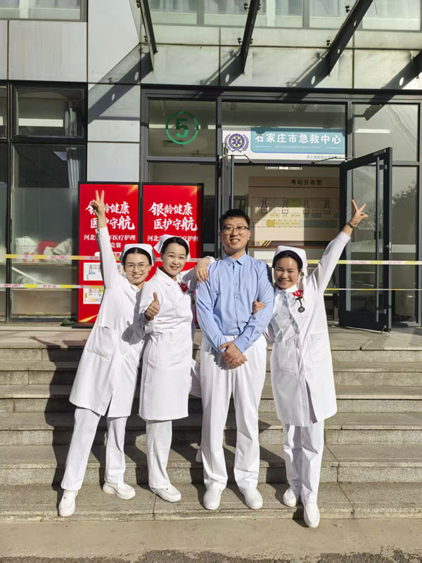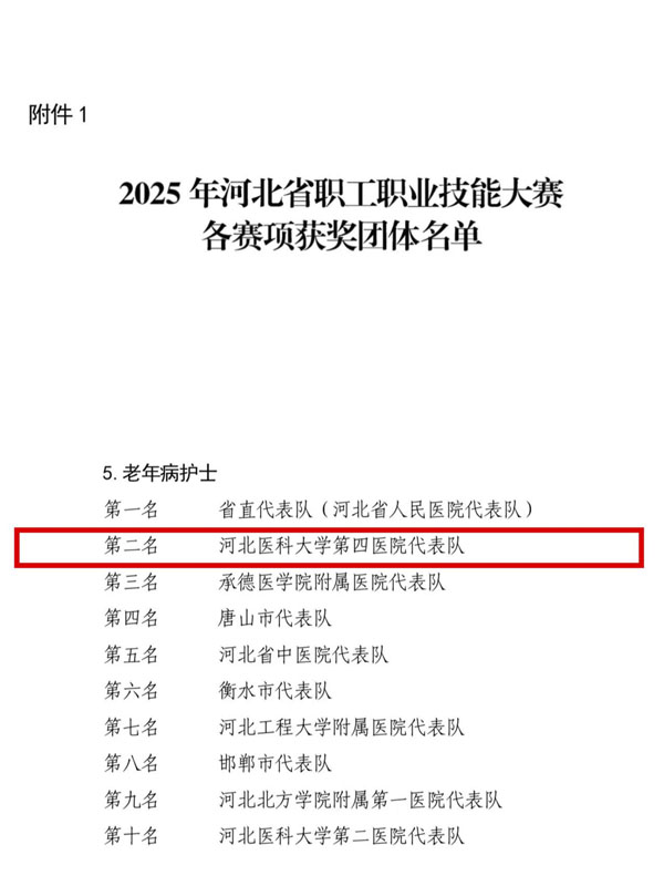 近日,由河北省总工会、河北省人力资源和社会保障厅、河北省卫生健康委员会联合主办的河北省老年医疗护理技能竞赛落幕。由重症医学科高鹏、李建宇,消化内科李亚楠和东院急诊科李占元组成的我院护理代表队,经过理论考试、基础操作、案例操作三个环节考核,在与全省63支代表队近300名选手同台竞技中脱颖而出,获得团体总分第二名。李占元、李建宇两名选手凭借优异表现成功跻身个人成绩前20名。