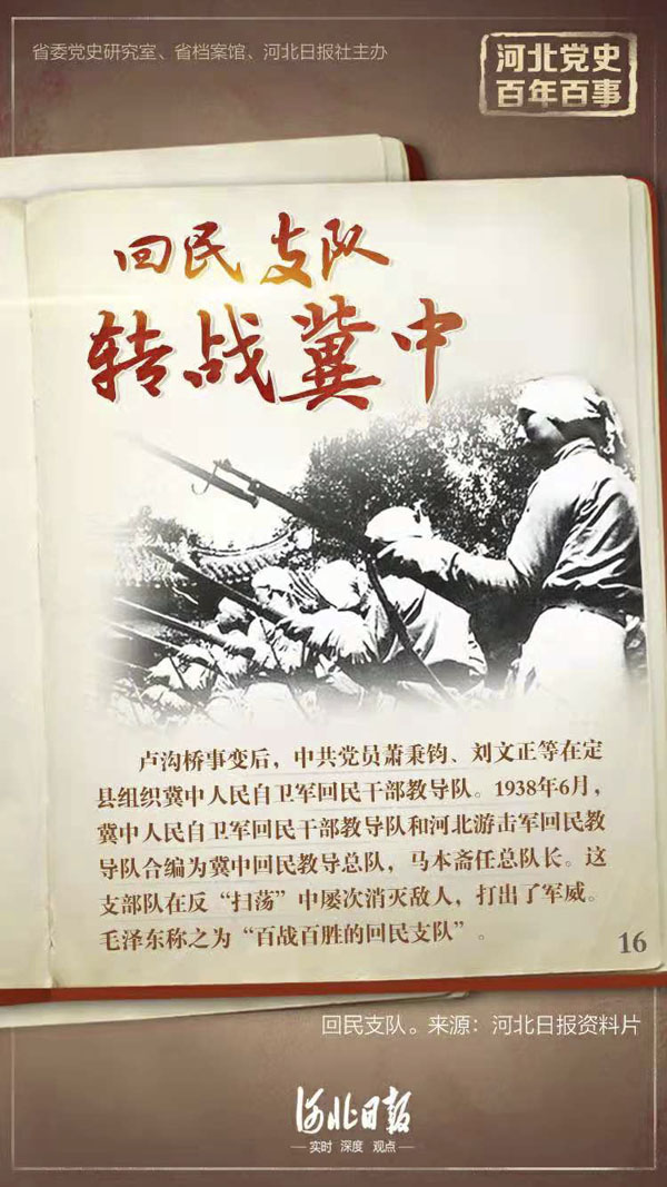 这支部队转战冀中,在反“扫荡”中屡次消灭敌人,打出了军威,被冀中军区誉为“无攻不克,无坚不摧,打不垮,拖不烂的铁军”。毛泽东称之为“百战百胜的回民支队”。1944年2月,回民支队奔赴延安保卫党中央。在后来的解放战争中,回民支队也立下了赫赫战功。