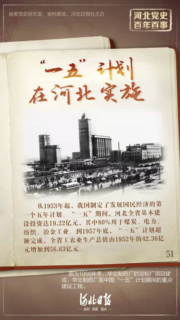 从1953年起,我国制定了发展国民经济的第一个五年计划,即“一五”计划。河北省结合自己的实际制定了“一五”计划的基本任务:集中力量发展重工业,有重点地进行基本建设,改善农业生产条件,发展贸易、交通、文卫事业,积极进行农业、手工业、工商业的社会主义改造。“一五”期间,全省基本建设投资达到19.22亿元,其中80%用于煤炭、电力、纺织、冶金工业。煤炭业投资3.37亿元,电力投资2.28亿元,纺织业投资2.834亿元。1954年10月,国家156个重点建设项目之一的石家庄热电厂一期工程开工兴建。1955年,苏联援建的全国最大的化学药品工厂——华北制药厂也开始兴建。同时兴建的还有保定造纸厂、保定胶片厂等,许多大型的水利工程也开工建设。在全省人民共同努力下,到1957年底,“一五”计划超额完成,全省工农业生产总值由1952年的42.36亿元增加到56.63亿元。