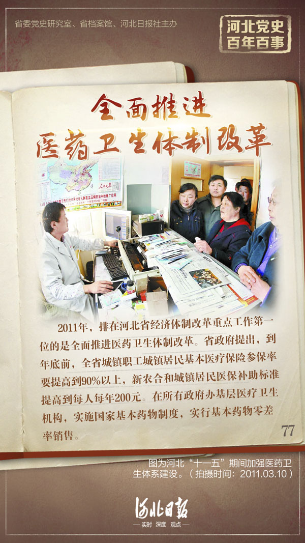 2011年,排在河北省经济体制改革重点工作第一位的是全面推进医药卫生体制改革。河北省政府提出,到年底前,全省城镇职工城镇居民基本医疗保险参保率要提高到90%以上,新农合和城镇居民医保补助标准提高到每人每年200元。在所有政府办基层医疗卫生机构,实施国家基本药物制度,实行基本药物零差率销售。同步推进基层医药卫生体制综合改革。3月25日,全省深化医药卫生体制改革会议提出,要深化医药卫生体制改革,切实把基本医疗卫生制度作为公共产品向全民提供,增强基层医疗卫生机构的服务能力,使更多的居民不出社区、不出乡村就能看常见病、多发病,加快建立覆盖全省的医疗保障体制机制,为保基本、强基层提供长效保障。当年,河北省政府先后出台《关于全面推进医药卫生体制改革的意见》等15个文件,制定了多项配套措施,着力推动重点改革。