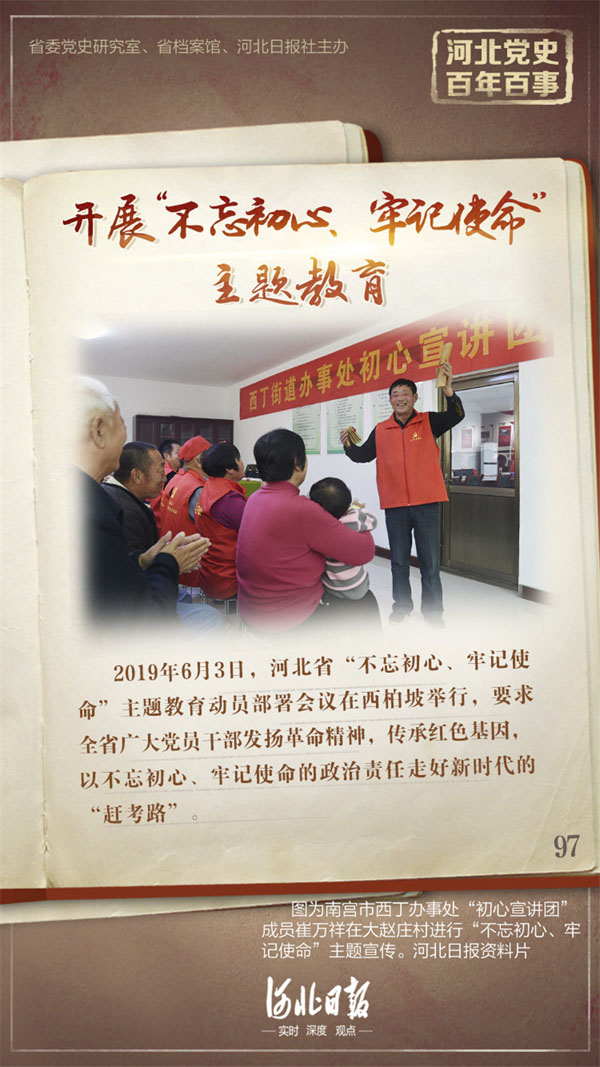 在全党开展“不忘初心、牢记使命”主题教育,是党的十九大作出的重大决策。2019年6月3日,河北省“不忘初心、牢记使命”主题教育动员部署会议在西柏坡举行,要求全省广大党员干部发扬革命精神,传承红色基因,以不忘初心、牢记使命的政治责任走好新时代的“赶考路”。按照中央统一部署,在中央第八指导组指导下,河北省第一批和第二批主题教育单位突出主题主线,紧密结合河北实际,坚持高站位谋划、高标准推进、高质量落实。在中央确定8个专项整治基础上,河北省结合实际增加优化营商环境、防范化解重大风险两个专项整治,列出10个专项44类问题,逐一明确牵头省委常委、责任部门、主要任务和完成时限,建立问题清单和整治台账,成立工作专班,实行项目化推进。各级党组织真抓实抓,广大党员干部积极投入,主题教育达到预期目的,取得丰硕成果。