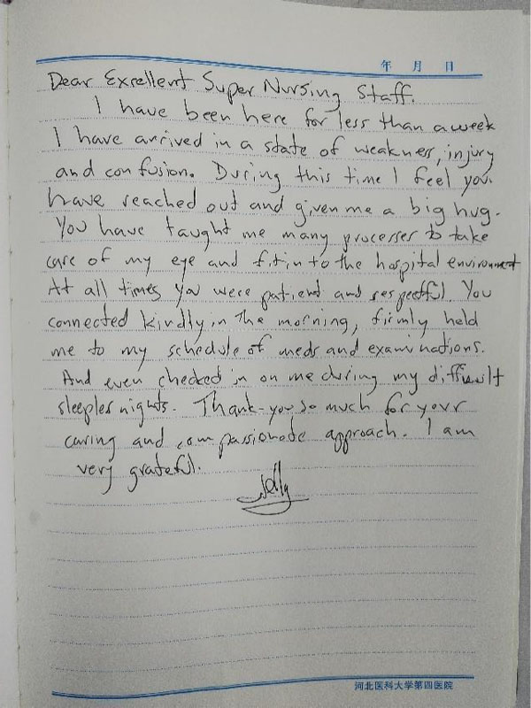 Thank you so much for your caring and passionate approach .I am very grateful .”(非常感谢你们的关心和热情,真的非常感激)。近日,在我院眼科病房,一名外国患者向郝玉华教授及眼科全体成员表达了诚挚地谢意,此前,他顺利接受了视网膜脱离手术,在精心治疗呵护下,术后恢复顺利,平安出院。