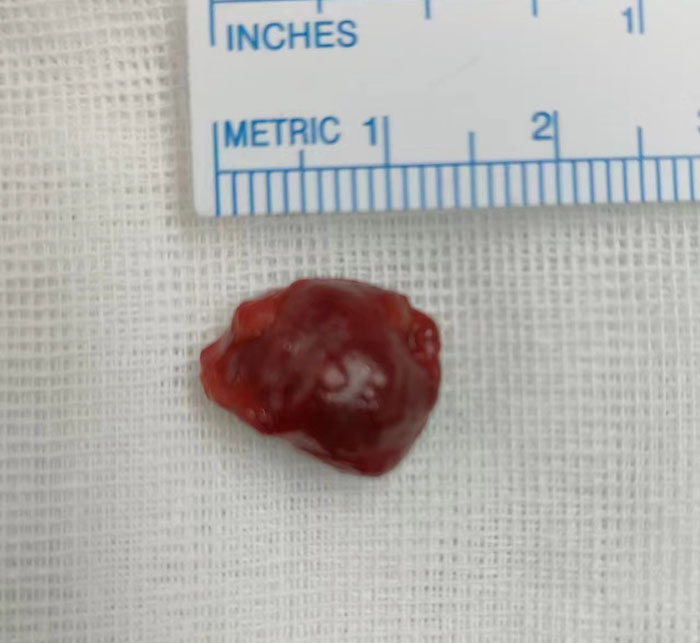 郝玉华主任及主管医生充分交代手术风险后,患者手术意愿强烈。在经科室讨论、商议手术方案后,决定在全麻下为患者实施外侧开眶入路,行眼眶肿瘤摘除手术。此项手术是对眼科手术团队的一次重要考验,轻、柔、细、巧的功夫缺一不可。在郝玉华主任、魏广川主任医师、张希奎主治医师、陈鹏飞主治医师眼肿瘤团队的精心协作下,对肿瘤精准定位,很好保护与处理了紧密粘连的视神经、肿瘤周围血管,肿瘤被顺利切除,病理回报为海绵状血管瘤。去掉了眼中的“炸弹”,患者连连称赞。
