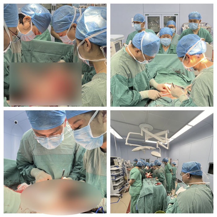 手术开腹后,术者发现子宫与腹壁、两侧盆壁粘连紧密,严重程度超过预期。大家通力协作,小心分离粘连后,找到了可以进腹的通路,在近子宫底部避开血管、切开子宫,顺利娩出胎重2320g的男婴。产妇自宫腔向子宫切口有大量鲜血涌出,张惠欣教授、杨志芬及路月梅副主任、刘广谱医师默契配合,迅速压迫缝扎止血、小心分离粘连,可见子宫下段肌层缺失,遍布迂曲怒张的血管,手术难度极高。